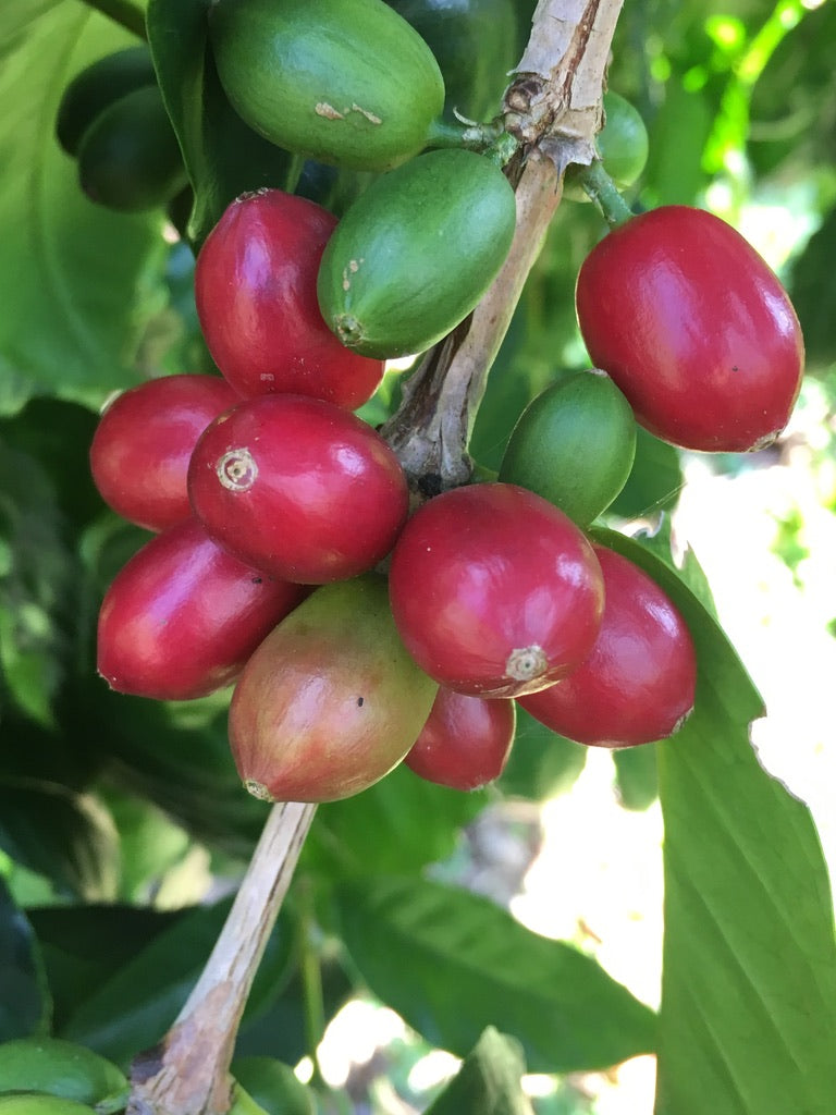 ハワイでこの品種を栽培している農園はほんの一握りで、ほとんどが数本の樹木しかありません。私たちの農園は、アロハヒルズが所有するコナのカイナリウにある標高2,000フィートを超える農園で栽培されています。10年以上前、彼らは持っていた種がティピカ種だと思い込み、誤ってこのコーヒーを数エーカーの土地に植えてしまいました。木が成長するまで、この間違いに気づきませんでした。10年前にミゲルにこのコーヒーを見せたところ、彼はその品質に感銘を受け、ティピカ種を植え直すのではなく、畑をそのまま残して別々に収穫するように勧めました。それ以来、ミゲルはこの特別なコーヒーの栽培地探しを手伝ってきましたが、今年初めて自らチェリーを入手して加工することができました。